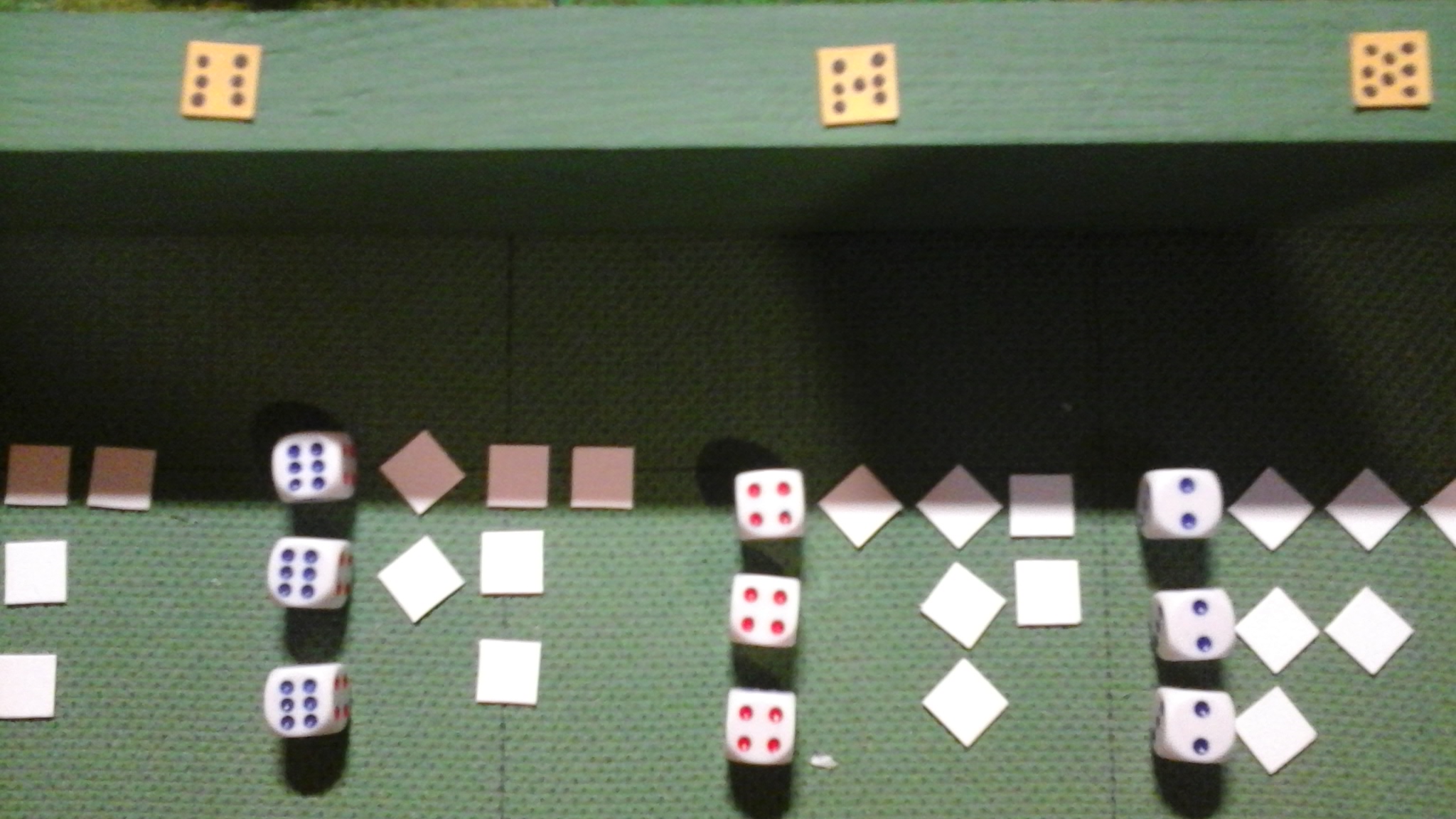 В зависимости от урона,шарик поворачивается нужным числом на грани или убирается в "копилку,тем самым снимая треть от численности.показатели-шарики,ромбы,квадраты расположены в лини сверху вниз.
