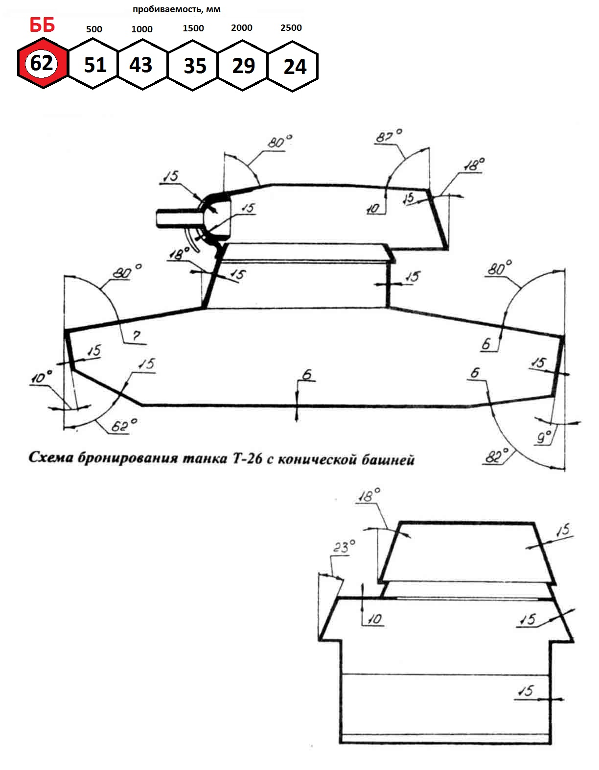 Проблема.- похоже, надо даже делать свою схему, с уже усредненным бронированием.б) Даже у приведенного Т-26 есть два участка на верху корпуса (ВЛД и лоб подбашенной коробки) и два участка на НЛД с разным углом и бронированием. Все равно придется усреднять, причем не очень ясно в каких пропорциях.