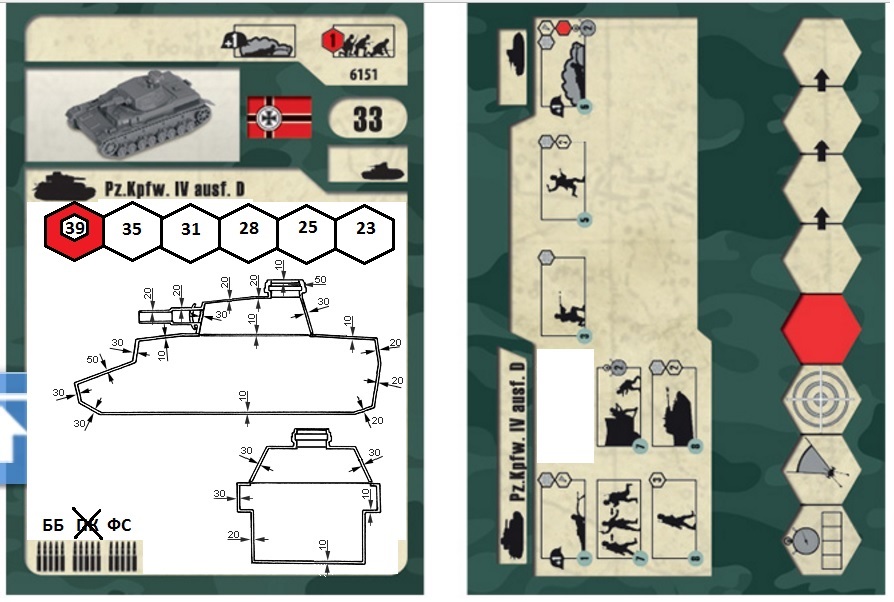 Я не против оживления, но пока хочу описать игру минимальным количеством параметров, т.к. чем меньше параметров, тем проще понять, в чем проблема. Кроме того, пока не ясно, насколько будет перегружена игра. А так случайностей можно будет накидать очень быстро. Например распечатать несколько десятков маленьких карточек с надписями "уничтожен", "обездвижен", "не может стрелять", "уменьшен обзор" и т.д., и на каждое попадание брать по карточке. Это конечно будет несколько странно, когда весь взвод после одного попадания не сможет стрелять, но что делатьMarshal140 писал(а):+ к этому мы оживим игру на поле (нельзя забывать, что это игра) - не хочется превращать ее в холодный математический расчет